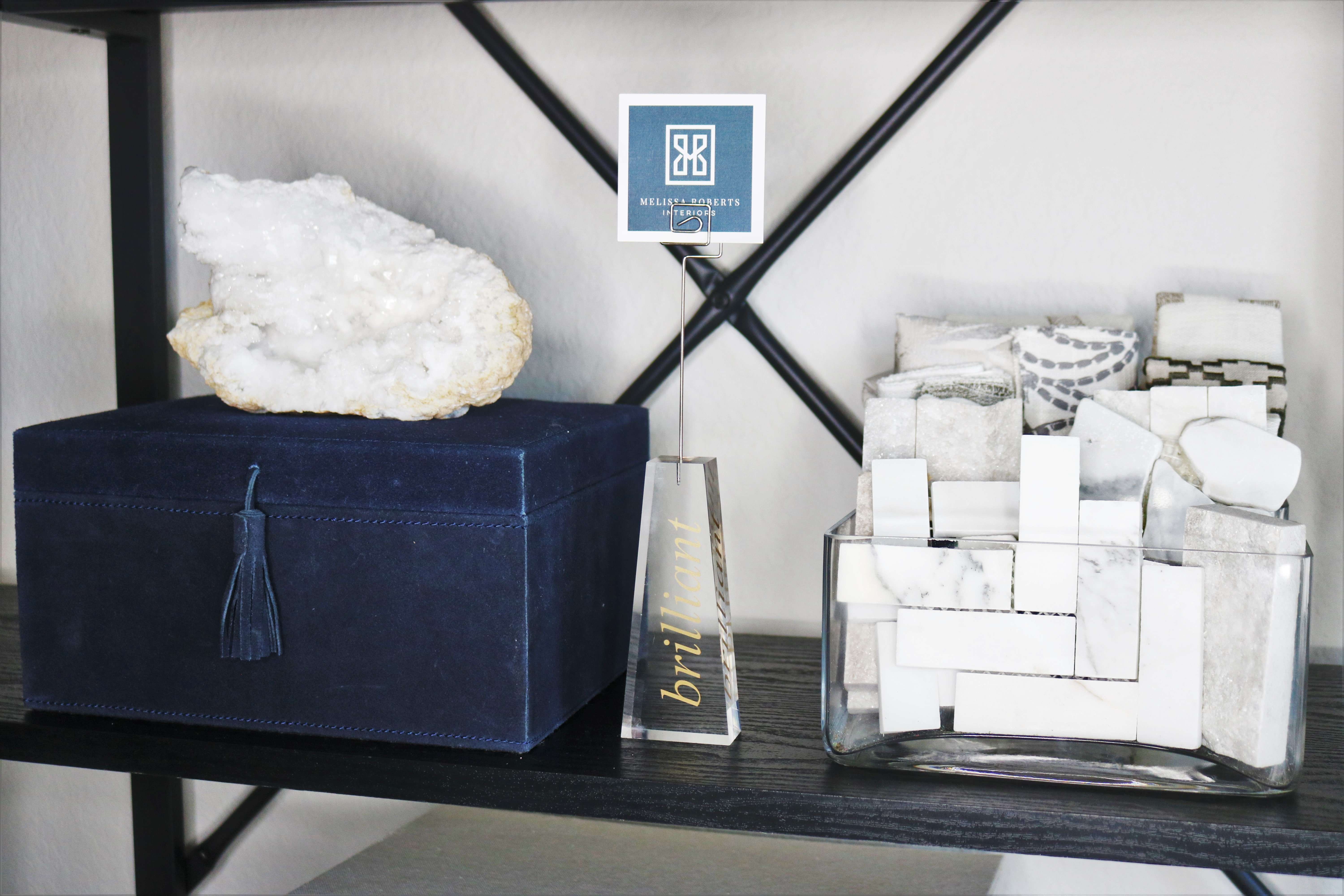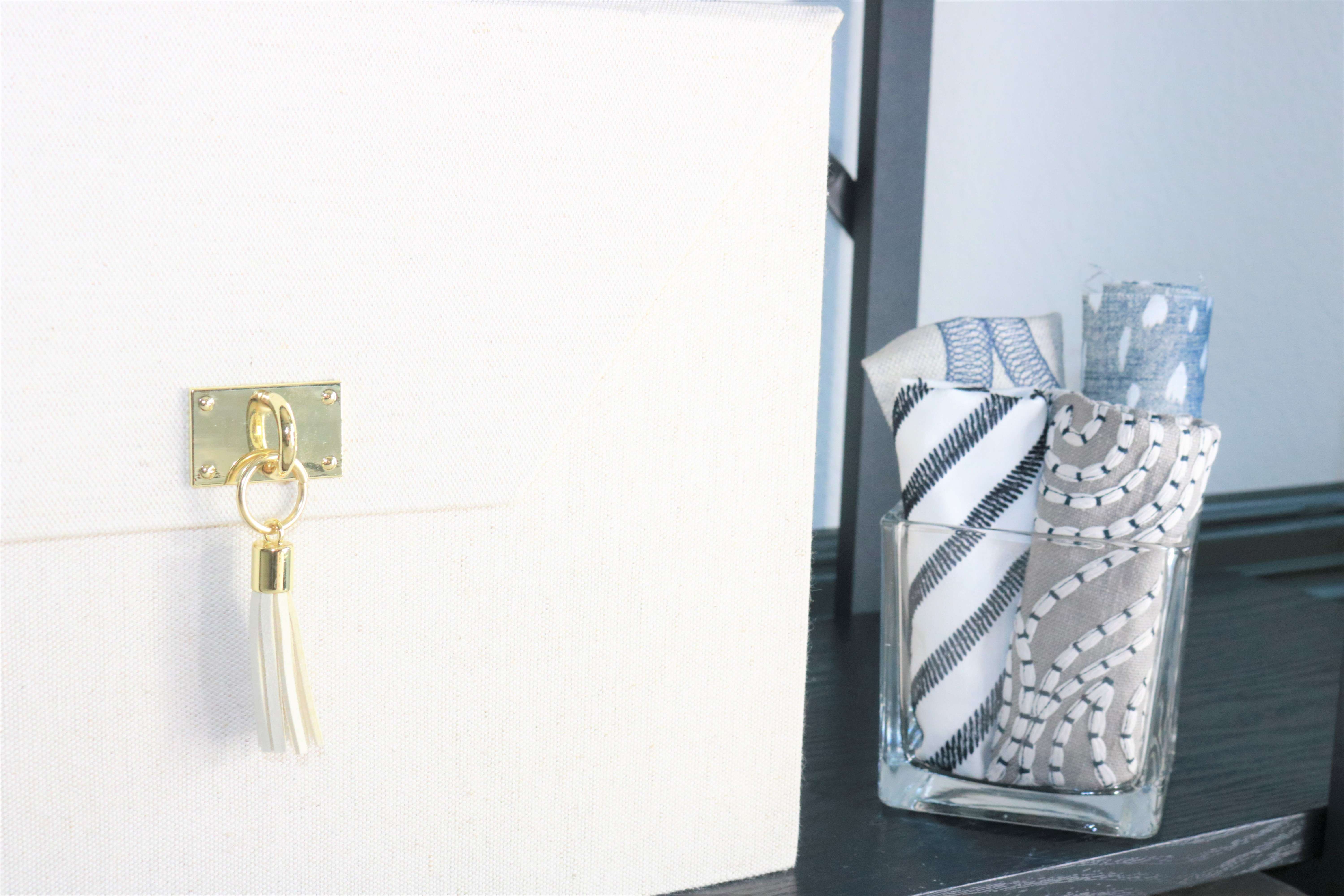 I love the modern, clean lines of this 5-tier storage bookcase. Most of the décor in this space is the work tools/material that I use on a daily, instead of storing it away I chose to showcase them in creative ways. Glass vases filled with tile and textile samples are a great display and accessible. I also keep the blue decorative boxes filled with essentials as well. And those adorable marble boxes, they hold more paperclips and office supplies. Get creative and see what kind of fun ways you can store your not so pretty must-haves.