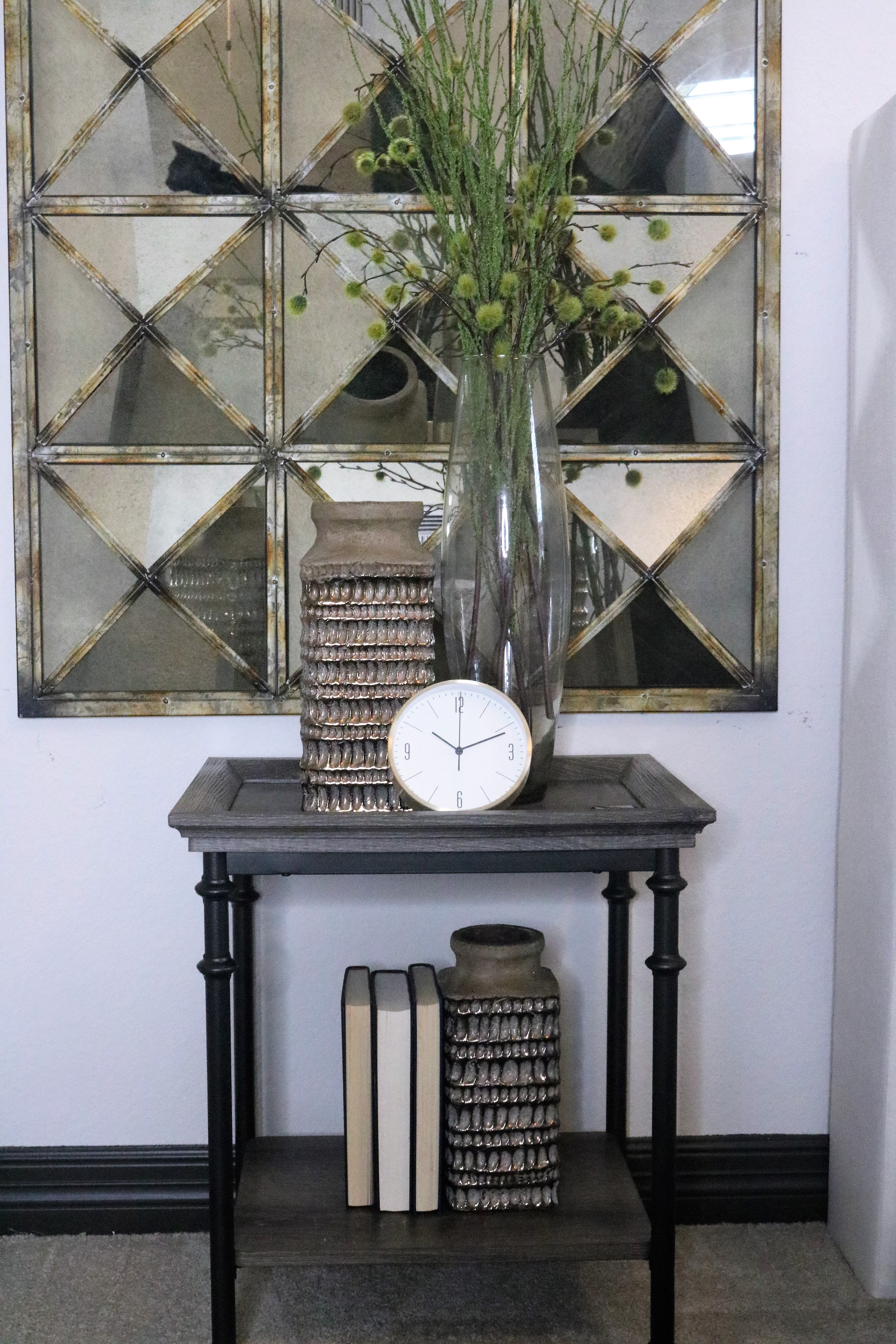 Having a full-length mirror is such a treat in any bedroom, adding in an over-sized floor mirror to your space will make the room feel larger. The mix of wood and metal of this mirror struck the perfect balance between masculine and elegant. This mirror was a lucky find at Tuesday Morning, but I linked a similar one. Getting innovative in a small space is a must! I really wanted to add a vanity area in this room, but there was that space factor to consider. Adding a versatile piece like an accent table can be the perfect solution. It can double as a stool and create that vanity space for the ladies who need to apply their “face” in the mornings. The unique silhouette of this metal accent table added sleekness to the room.