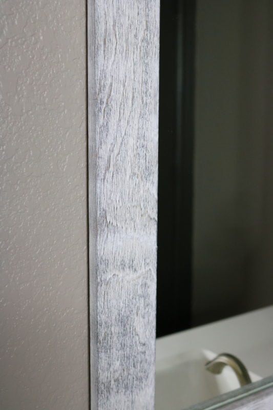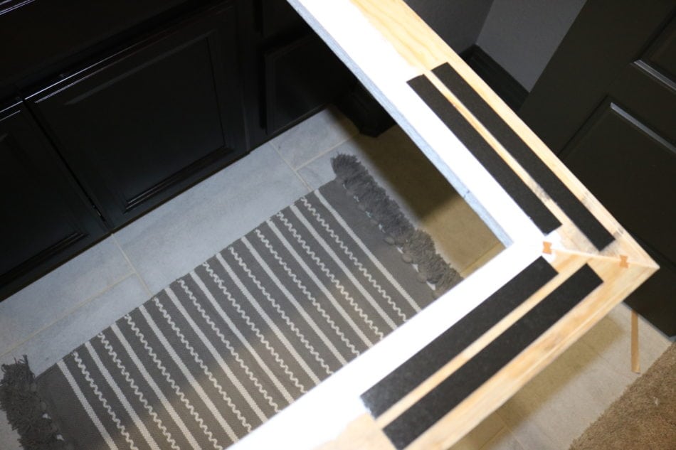 Remove the backing from the sticky strips from all 4 sides, align the corners, and press the frame firmly to your mirror. My mirror isn’t over sized so I was able to do this completely by myself.
