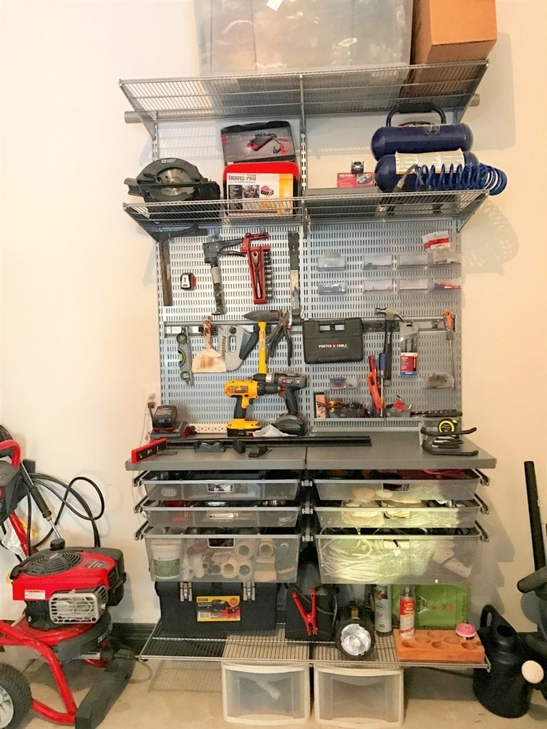I don’t really have a reason to spend a lot of time in our garage…thankfully! But it has been one hot mess since we moved into our new house in July. As 2017 came, I decided I would channel my energy into the garage space first to de-clutter, organize and revamp. As I was working I made three piles: keep, donate and trash. It’s important to go through items and not keep things you never use. I then sorted the keep pile into broad categories as that was sufficient enough for our needs (paint, electrical, power cords, etc). In the wall unit I wanted each drawer to be organized by function. For instance, drawer #1 was specifically for paint supplies only (which I should really just donate to some one because I do NOT like to paint).