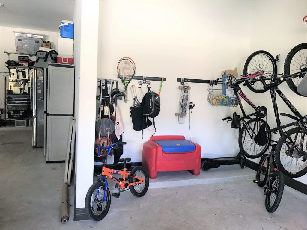 Something else I thought would make the garage work best was to keep all bikes, toys, and sports gear close to the garage door as my son uses these items often. This avoids accidents near the cars when he is getting these items in and out of the garage. My son rides his bike almost every single day so I decided to leave his bike on the ground instead of on a hanging rack. I purchased the unit from the Container Store and the other wall tracks are from Lowes.