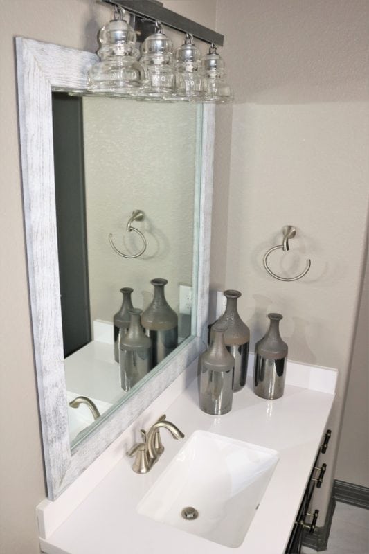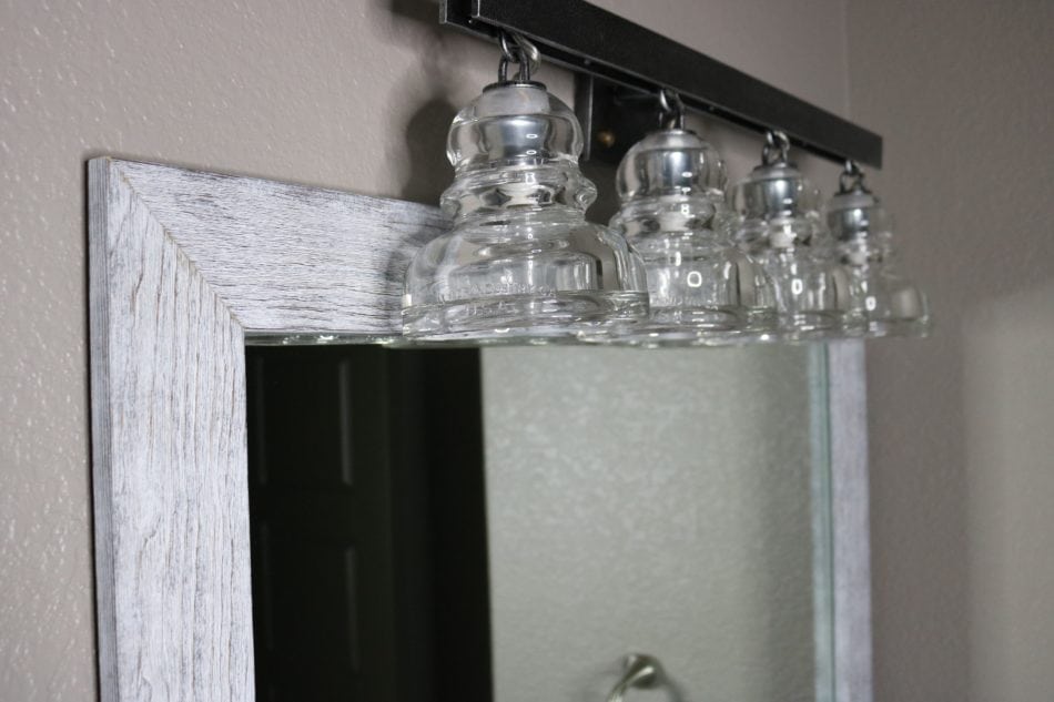 I plan to have the towel bars removed soon and replace them with something a bit more stylish. These plans are underway and will definitely be blogged once it’s complete. For now, I wanted to share the new cabinet hardware and the light fixture that helped bring this room to life. Of course this amazing frame attached to the old, existing mirror played a major role in this. Click here to read more about the frame!