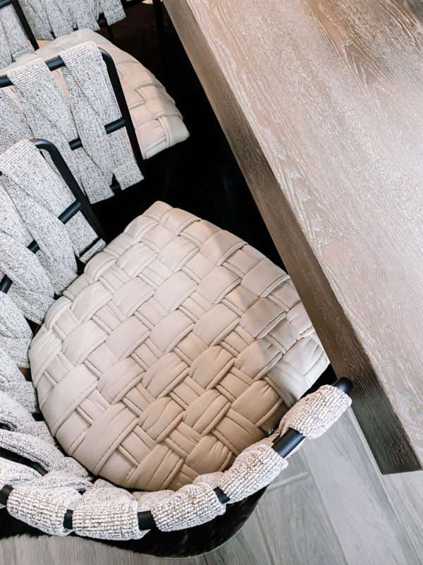 Dining chairs are an investment, and one you do not want to have buyer’s remorse after you purchase. It is imperative first to determine the overall vibe you want to achieve. Believe it or not, comfort and ease in cleaning are always my first criteria – again looking for longevity. Next, is uniqueness and I didn’t want a dining chair that I had already seen everywhere. Then came the Milano dining chair – SHOW-STOPPING. The woven back is a nod to the woven leather chairs in our living room. Again, playing off the hard/soft texture combination I love so much.