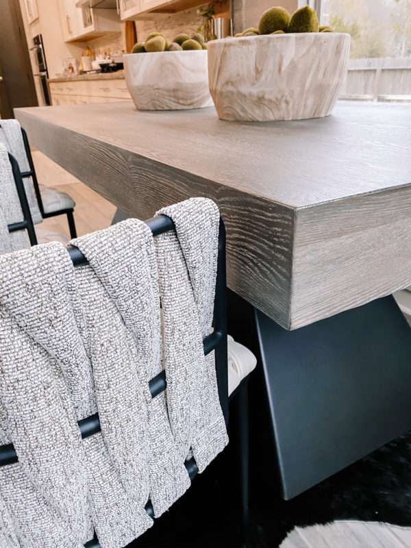 Utilizing industrial and modern furnishings can leave a room feeling a bit cold. To avoid that, you want to add finishing touches to warm the space. I incorporated beautiful textured pillows to the built-in bench. Not only are the throw pillows gorgeous, but they are also adding comfort for our dinner guests.