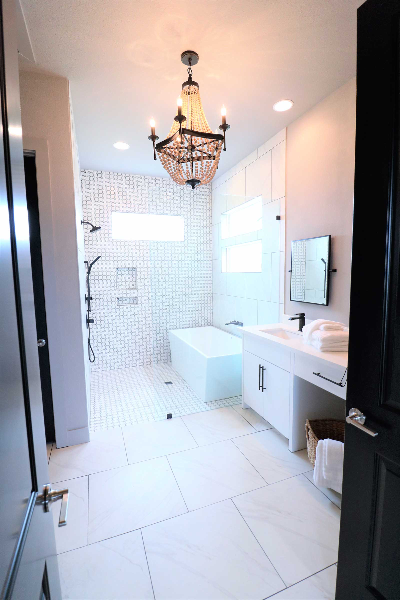 Less is more in this stunning bathroom! The wet space is the main feature of this bathroom! We included a larger soaker tub inside the shower to maximize this small space!