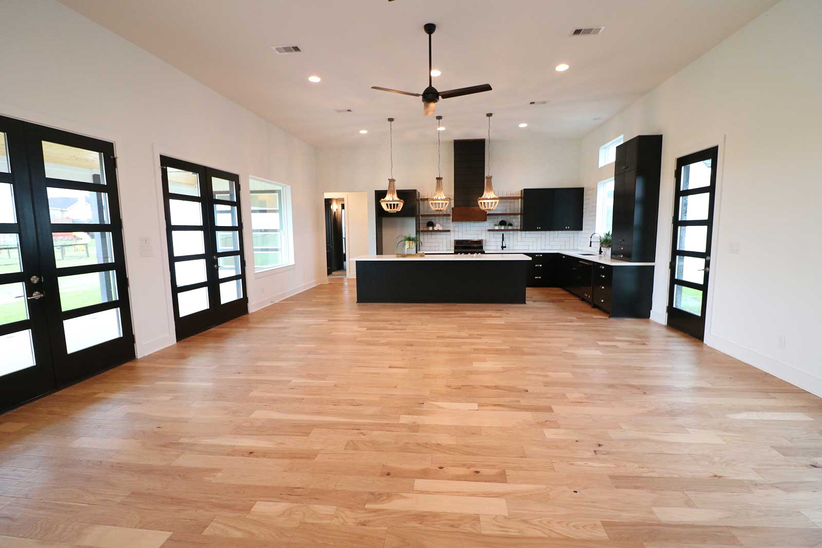 A simple foyer with windows that mimic the design of the exterior doors. Along with the unique horizontal window design and these gorgeous wood floors (American Hickory Natural Wood) guests have an eye-catching, but simple, first look at this divine farmhouse.