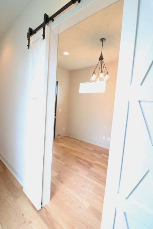 You can’t go wrong with barn doors in a farmhouse style home! These sliding French barn door, lead to the office! I love the black iron details of the doors against the white wood!