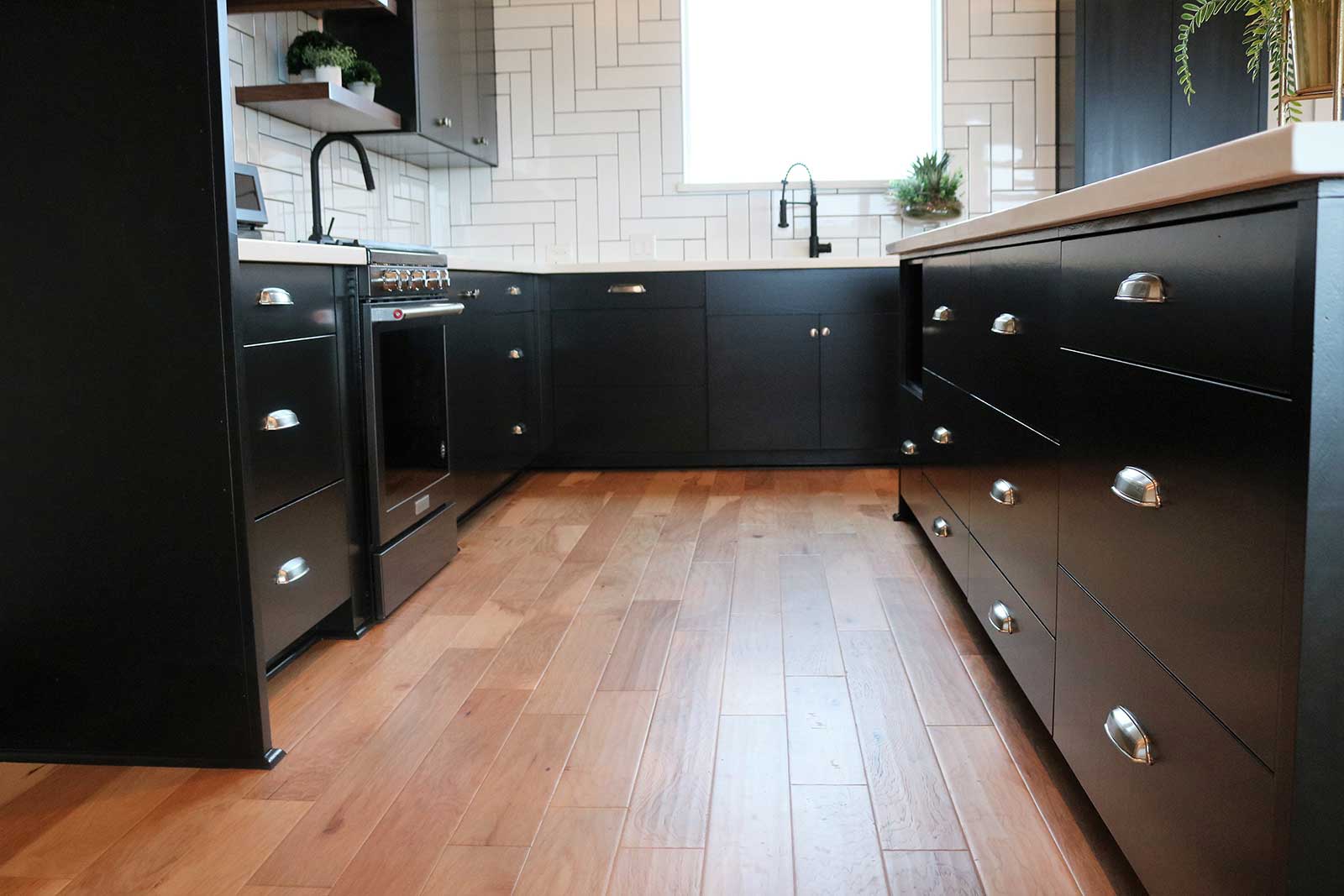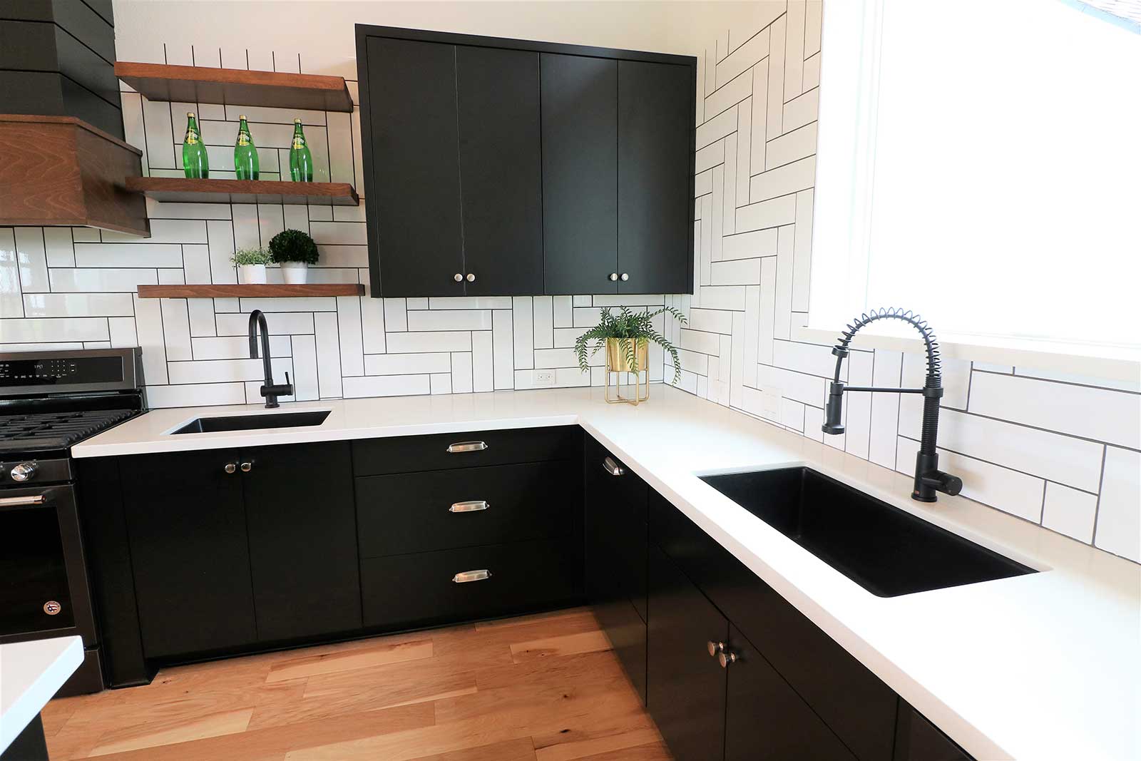 I love how beautiful this kitchen turned out! The black cabinets are finished in BM Black Satin with a satin finish. To keep your costs low use an oversized subway tile and use this dramatic pattern to create drama.