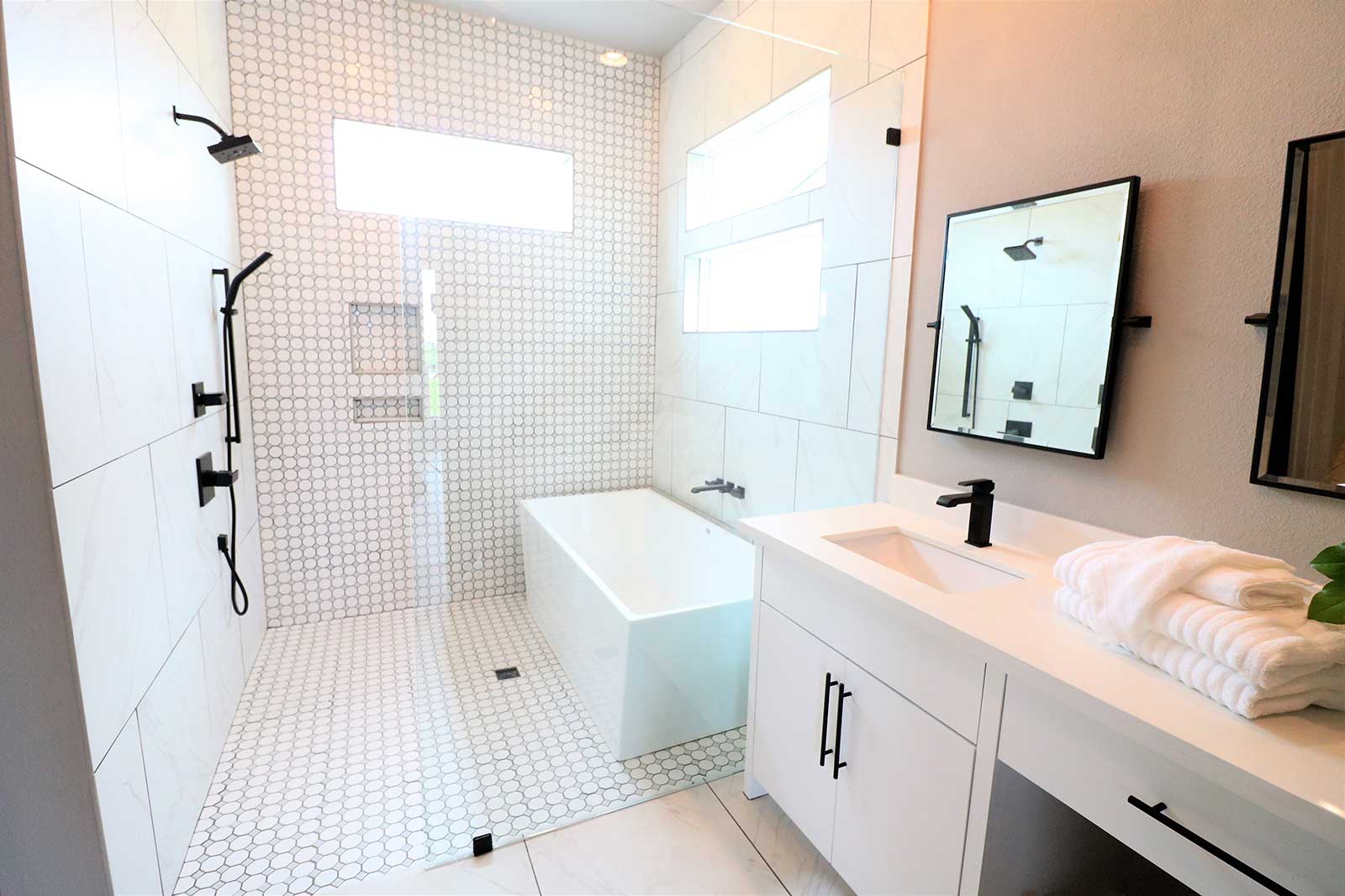 This master bathroom was so much fun to design! This dynamic bathroom was completed with the continuing black, white neutral color scheme, a gorgeous wet space, and matte black hardware to give this room the polished, fresh look the clients were going for!
