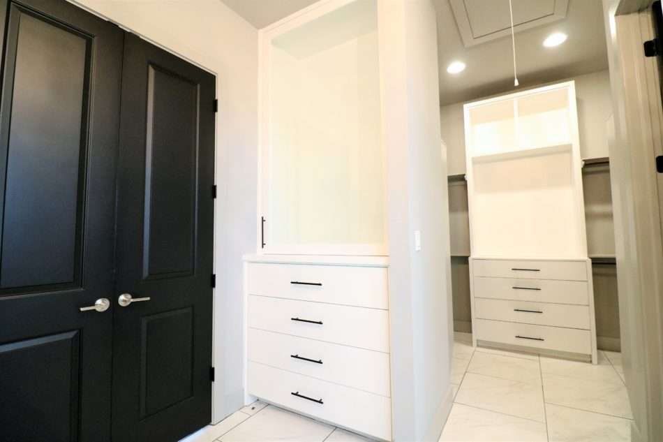 In this walk-in closet, we included a ton of built-in storage for this his and hers closet that will make your jaw drop! I designed this oversized shadow box complete with lighting inside to display the wedding gown and shoes for years to come.
