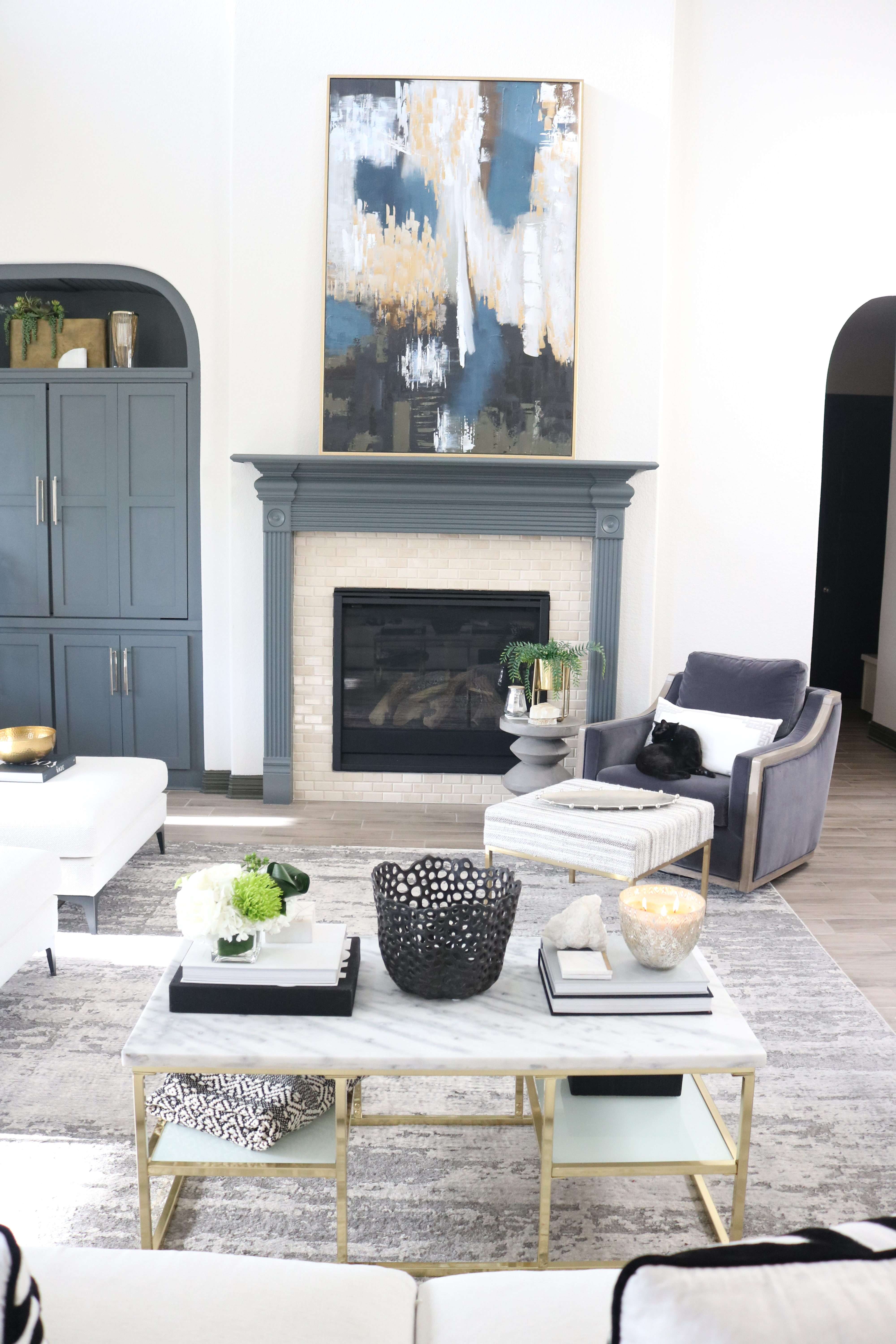 The area to the right of the original fireplace always felt off-balance and insufficient. I continually tried to add décor (fiddle fig, chair, etc.) to compensate for the lack of balance. When coming up with the new design, this was something I hyper-focused on to eliminate this problem. With the addition of floating shelves that seamlessly connected to the focal point of the fireplace, I was able to utilize the space but also add that unique design; I knew the area deserved.
