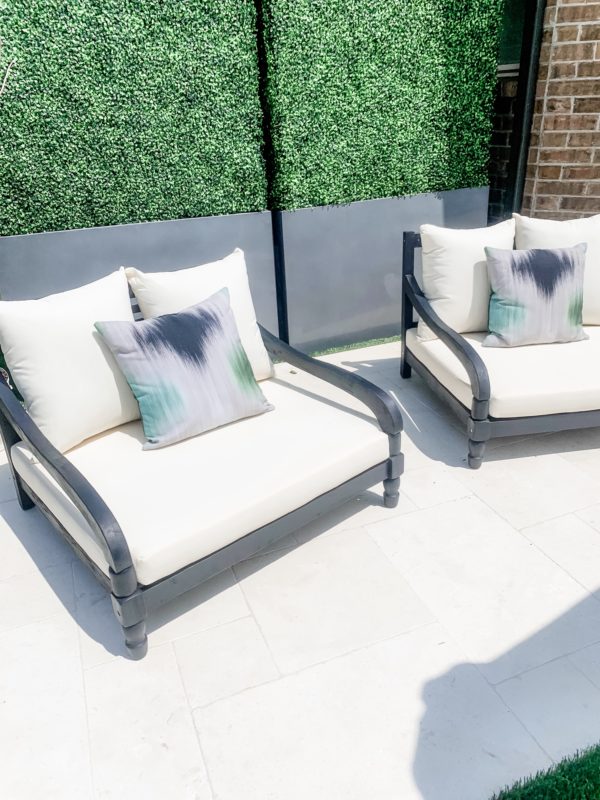 When selecting accessories & textiles for the patio and the pool area, I wanted to continue the modern vibe using a black and white color palette with organic pops of green. I fell madly in love with the geometric rug, sold here & here! When designing this modern outdoor pool and patio, my motto was “GO BIG or go home!” While selecting the furnishing pieces, I wanted them to reflect that same attitude. This may be the softest outdoor rug I have ever seen!