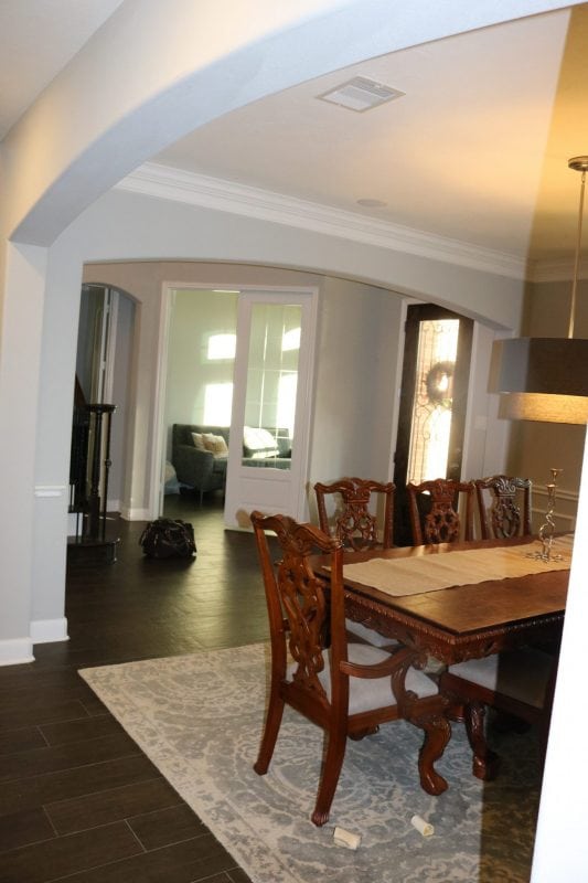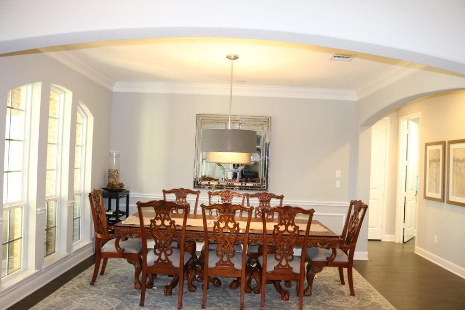 Can we please take a moment to admire this dining room? This dining set was passed down from the mother and is something special in this house. I love that we were able to use this traditional set and incorporate more modern pieces. The room started with builder grade paint and trim work. We didn’t have a large budget for this room. I mean let’s be real. Not every one has thousands to spend on home decor! Plus we needed to maximize our budget in the office. But I love how we made such a transformation by using contrasting paint to the bright white, chair rail.
