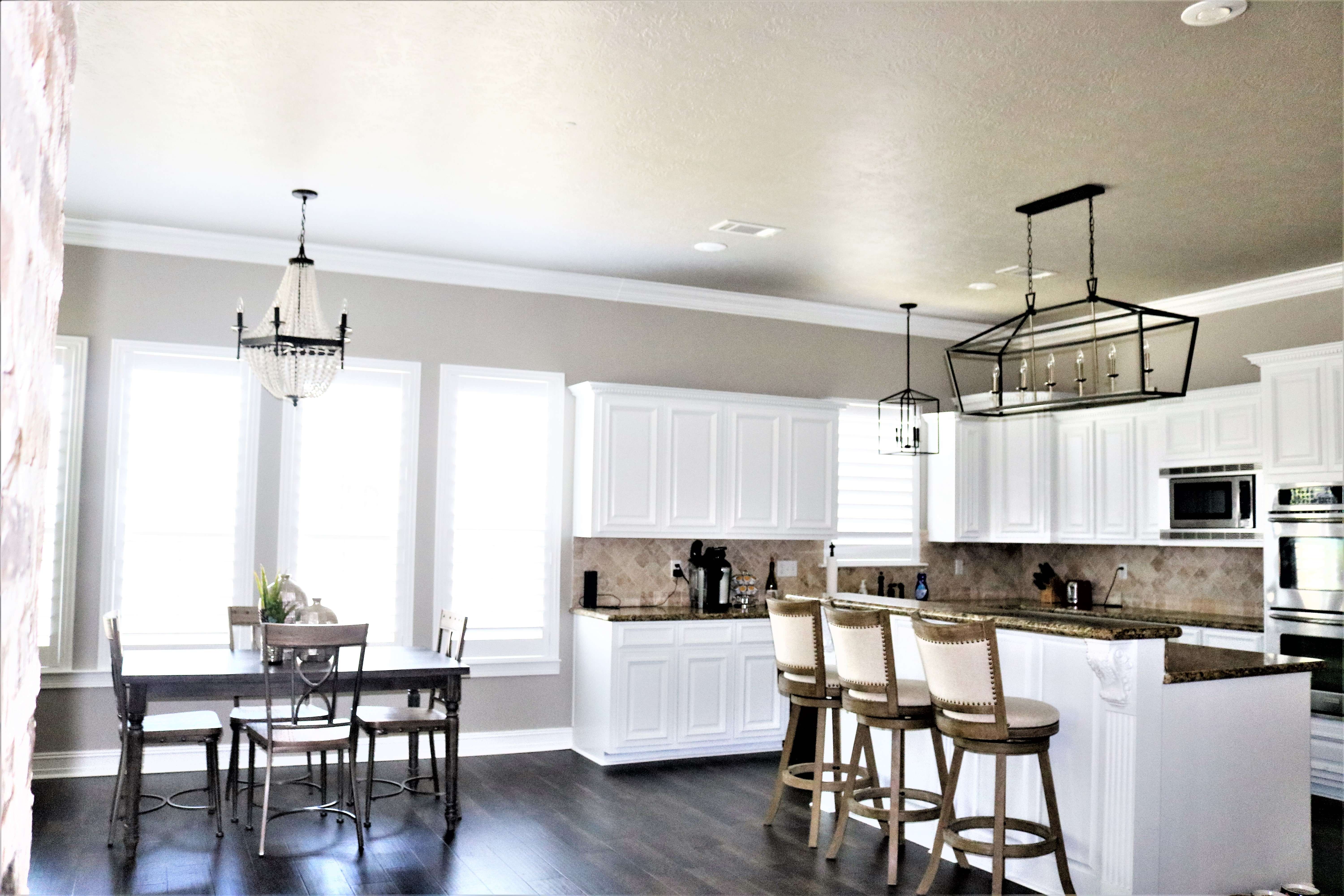 This breakfast and dining area got an elegant upgrade! A fresh coat of paint on the kitchen cabinets, new light fixtures, roman shades, and plantation shutters! In this area of their home, they wanted a quiet yet functional area to entertain guests and relax.