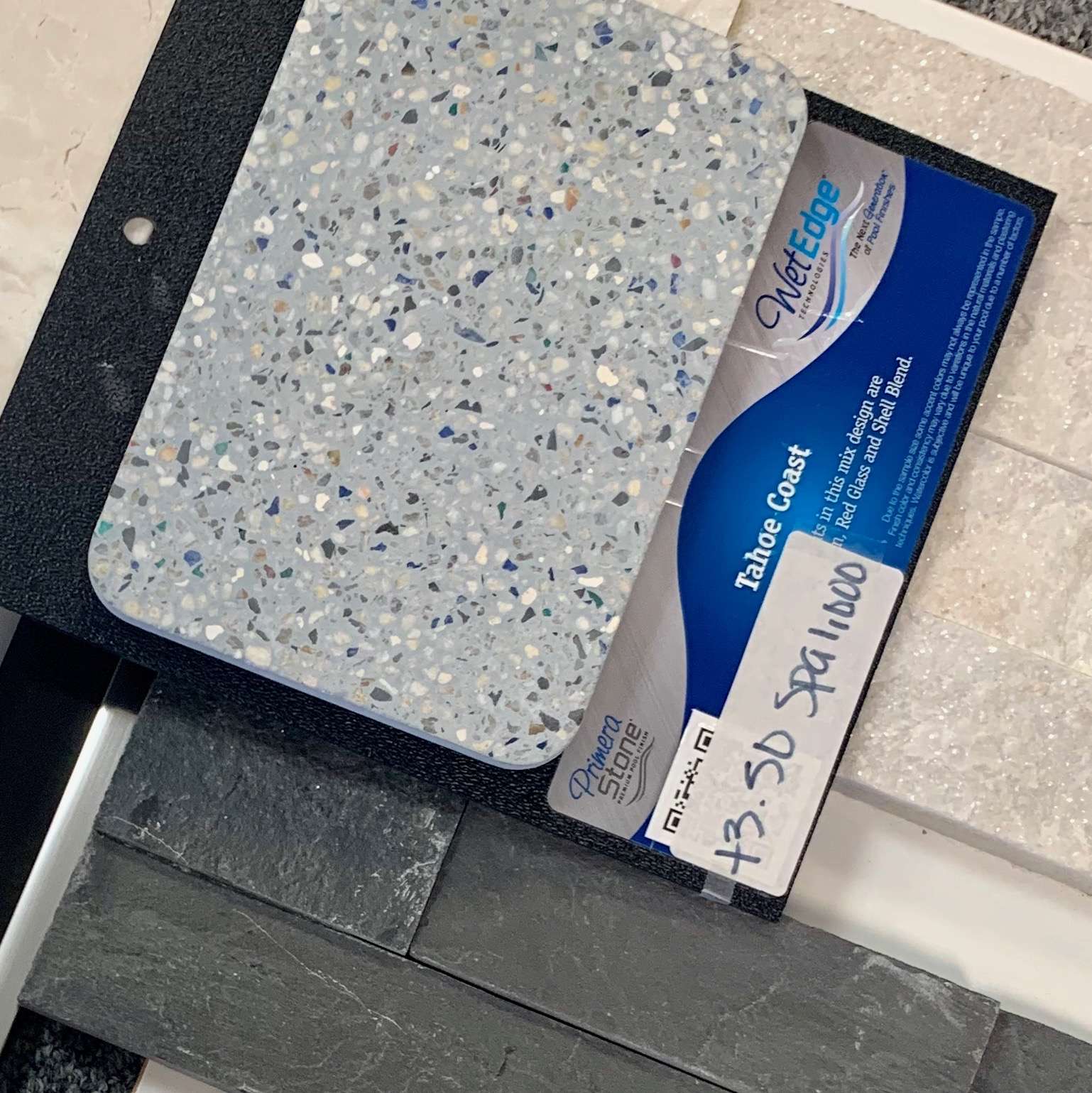 Determining the pool color was extremely difficult for me. I had no idea how to select the pool finish since they would appear differently once covered in water. I went to Google. One thing we new for sure is that we wanted the pool to have a smooth surface so the pebbles didn’t hurt our feet. I selected colors that were smooth the googled how they appeared on other pools. This worked out well; the end result is exactly what we expected. We chose Primera Stone-Wet Edge in Tahoe Coast finish.