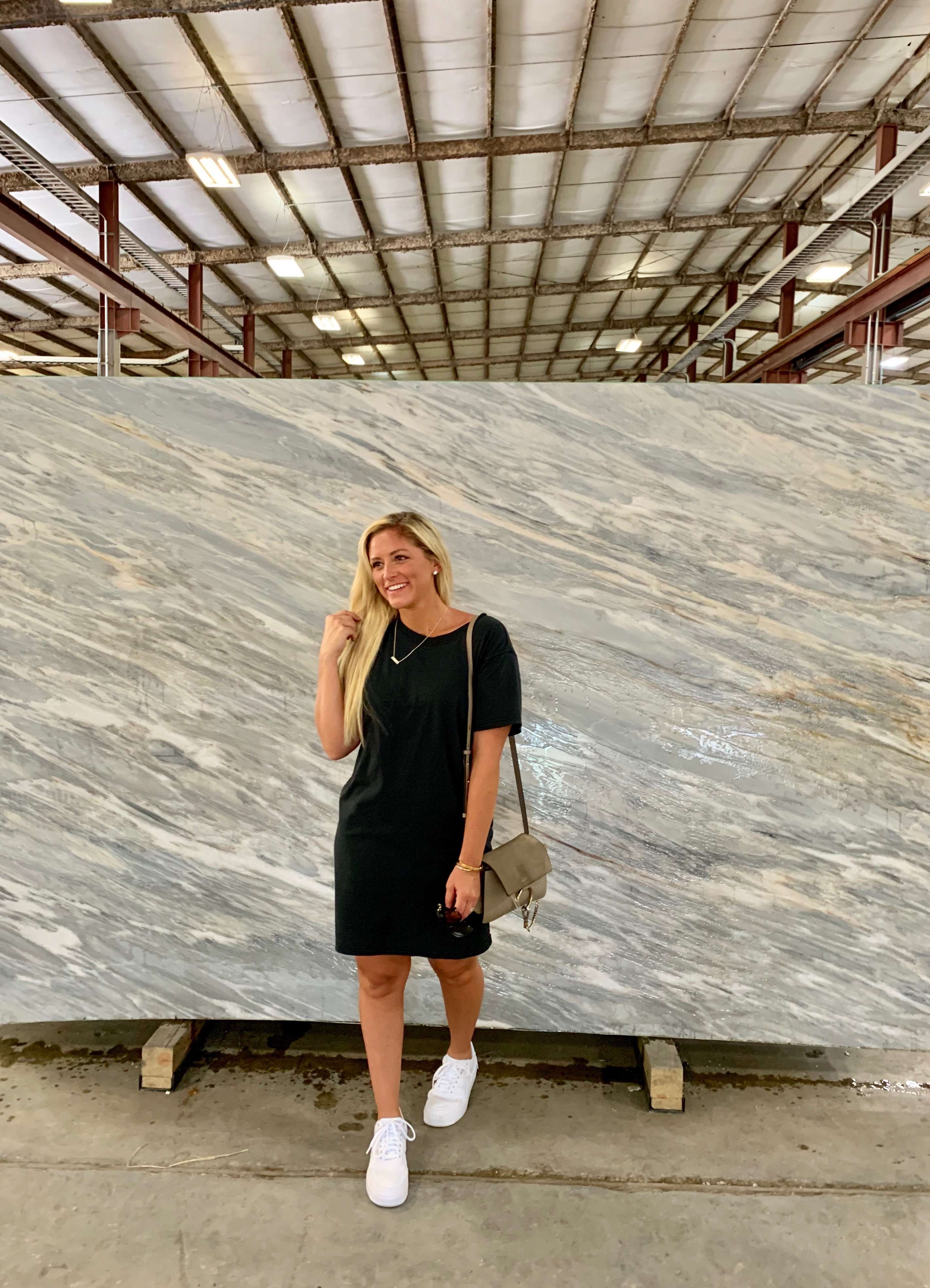 We made a family trip to the Maestro Surfaces to select a counter material. Nick and Maddox put in their two cents on the slab (and posed for what they call an “IG post) we should choose for the outdoor kitchen counter — selecting this stunning piece of Satinato Leather Quartzite. A natural stone with a gray base with beautiful diagonal veining with white and a hint of gold throughout having a soft almost wave-like pattern.